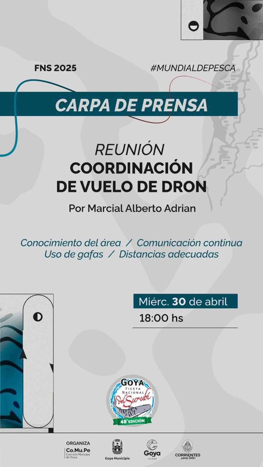 Con motivo del próximo Mundial de Pesca, evento multitudinario en el que estarán filmando desde el aire muchos pilotos, los invitamos a una reunión previa para coordinar los vuelos de manera organizada y segura. Definiremos zonas de vuelo, altitudes, frecuencias de comunicación y cualquier otro aspecto necesario para una labor óptima y segura.