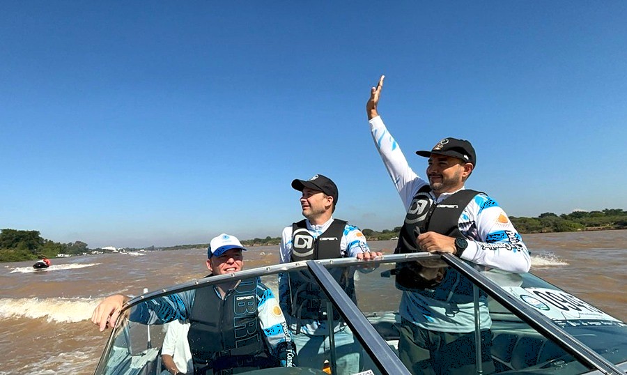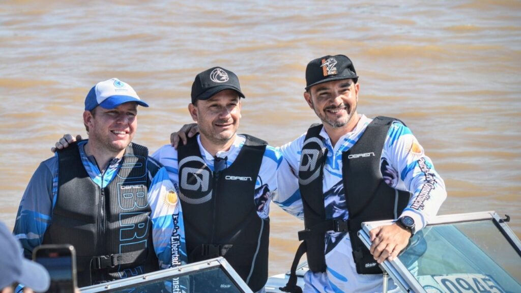 El intendente de Goya, Mariano Hormaechea, junto al intendente de Ituzaingó, Juan Pablo Valdés y el viceintendente de dicha localidad, Emilio Nicolás compartieron juntos la increíble largada de embarcaciones y están participando de la edición récord de la Fiesta Nacional del Surubí.