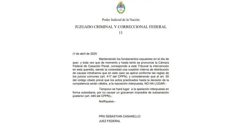Al fracasar la audiencia de conciliación, Casanello no aceptó los recursos de la defensa de Milei: resolvió rechazar “la reposición interpuesta” y tampoco “se hará lugar a la apelación”.