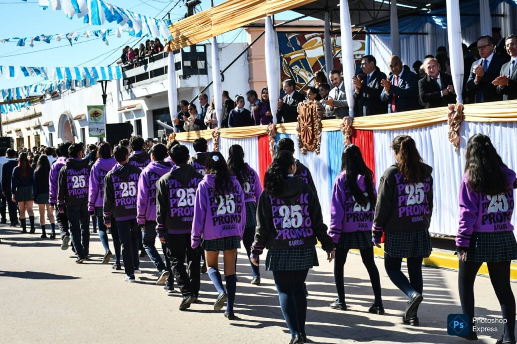 El acto tuvo lugar frente a la parroquia San Luis Rey de Francia, lugar icónico del pueblo que amalgama su fe, cultura y tradición. Funcionarios, fuerzas de seguridad, docentes, alumnos y vecinos entonaron las estrofas del Himno Nacional Argentino para luego escuchar las palabras del gobernador y el intendente.