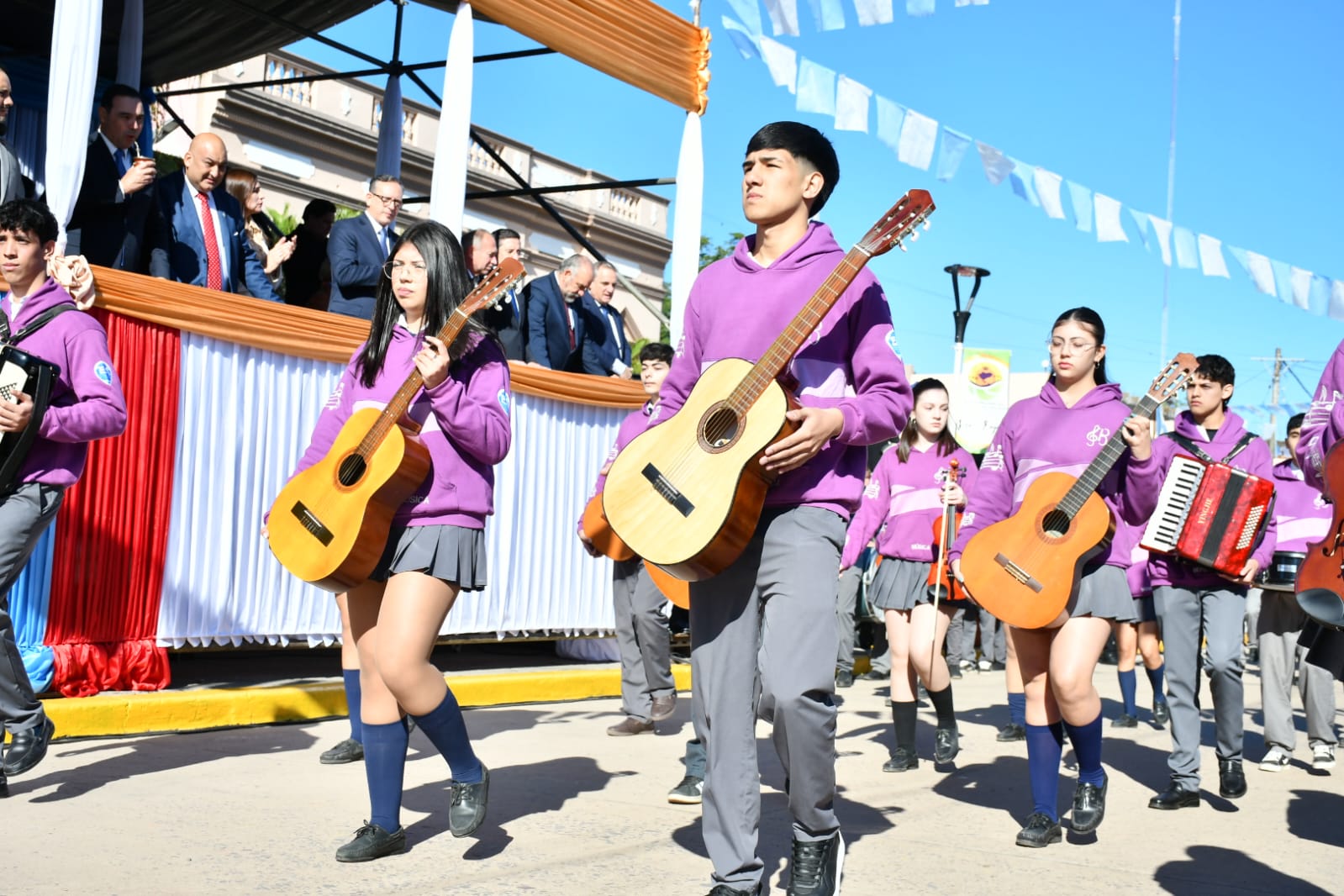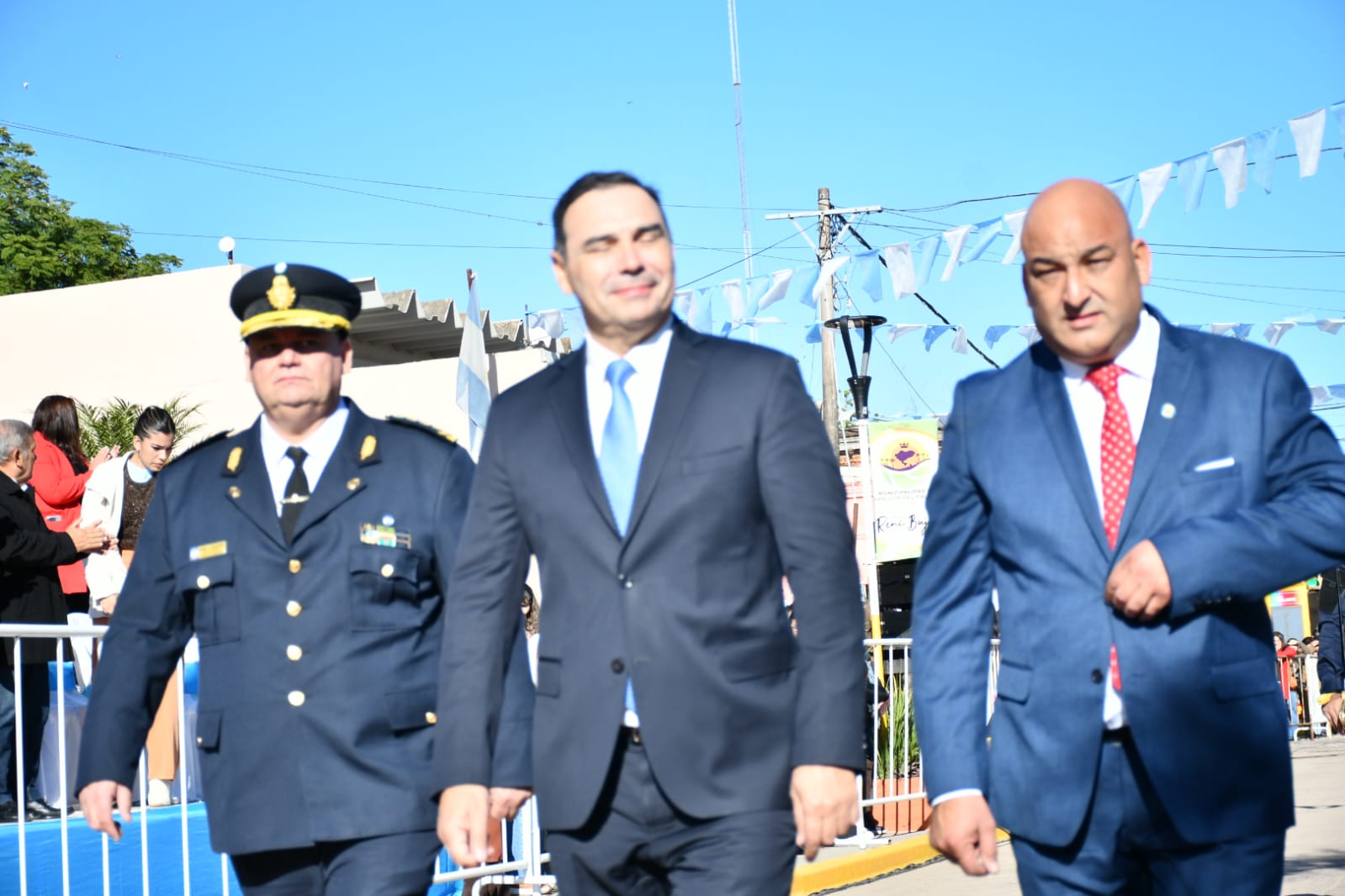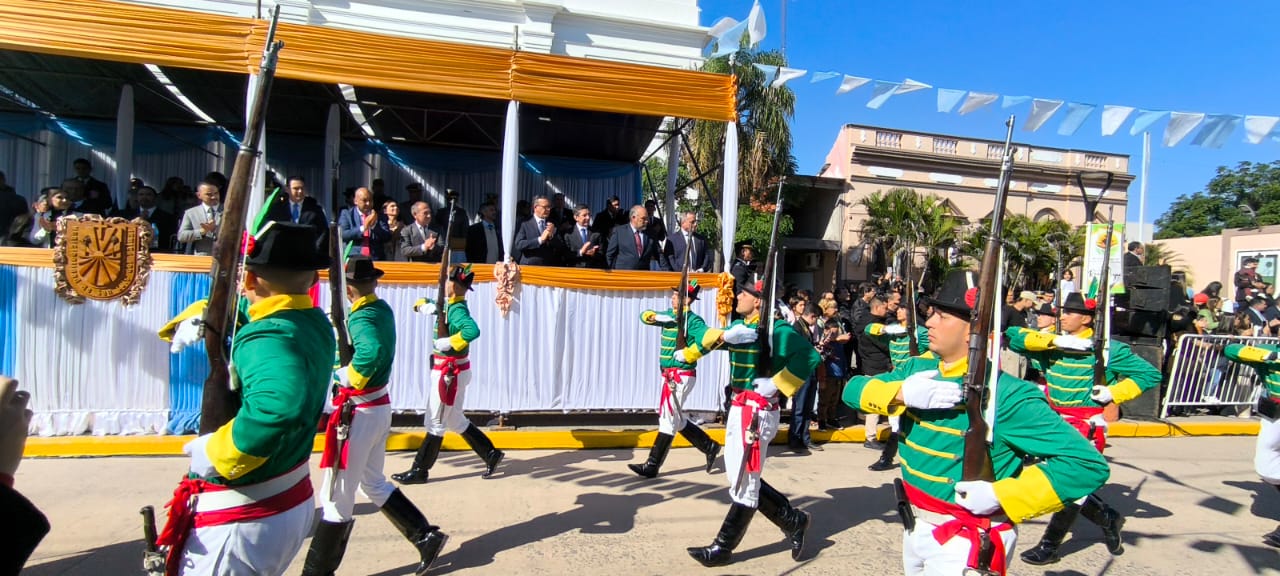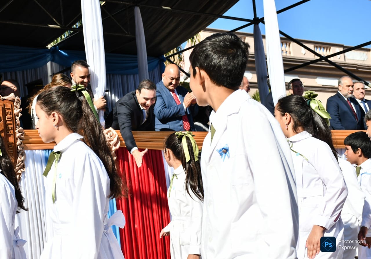 El acto tuvo lugar frente a la parroquia San Luis Rey de Francia, lugar icónico del pueblo que amalgama su fe, cultura y tradición. Funcionarios, fuerzas de seguridad, docentes, alumnos y vecinos entonaron las estrofas del Himno Nacional Argentino para luego escuchar las palabras del gobernador y el intendente.