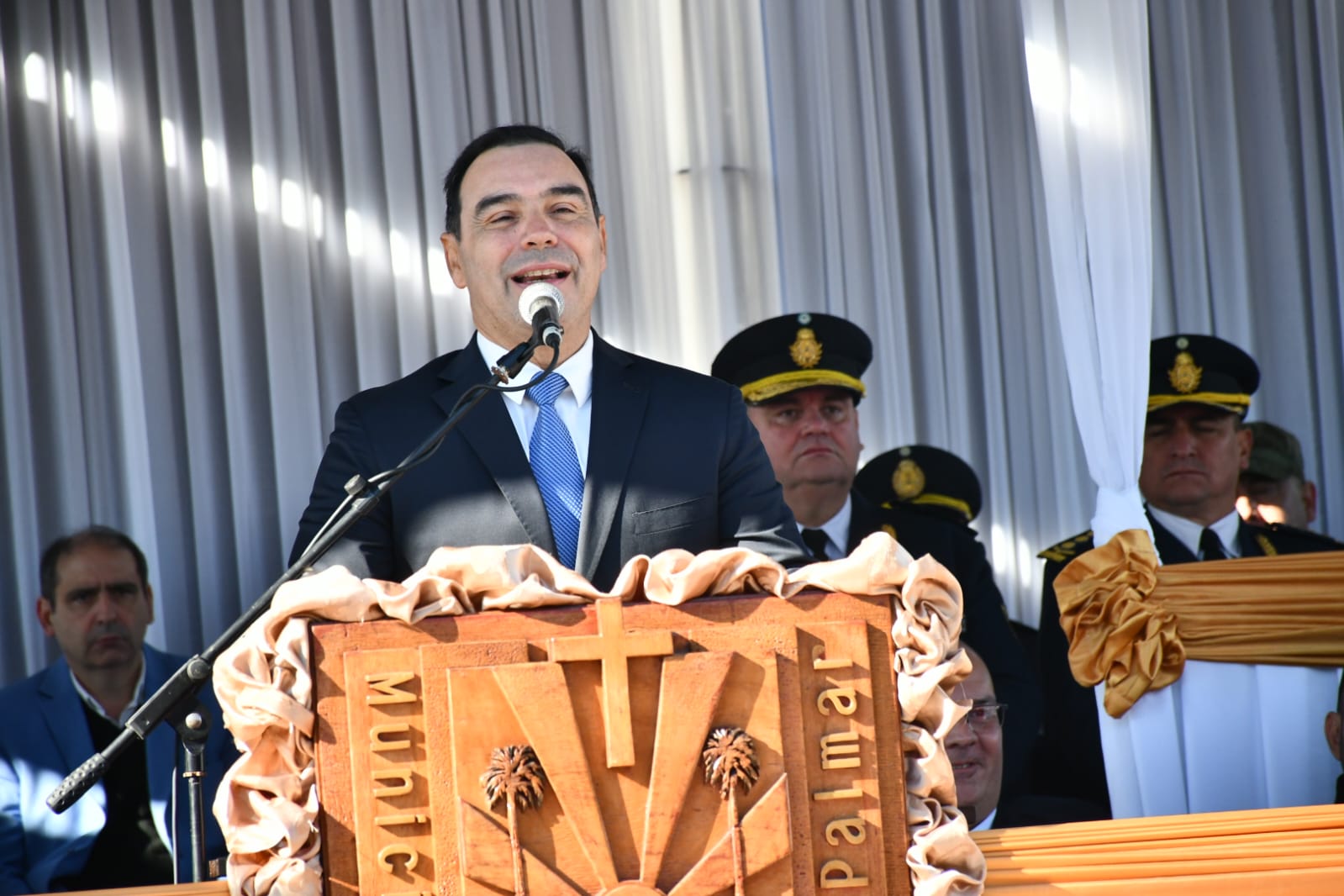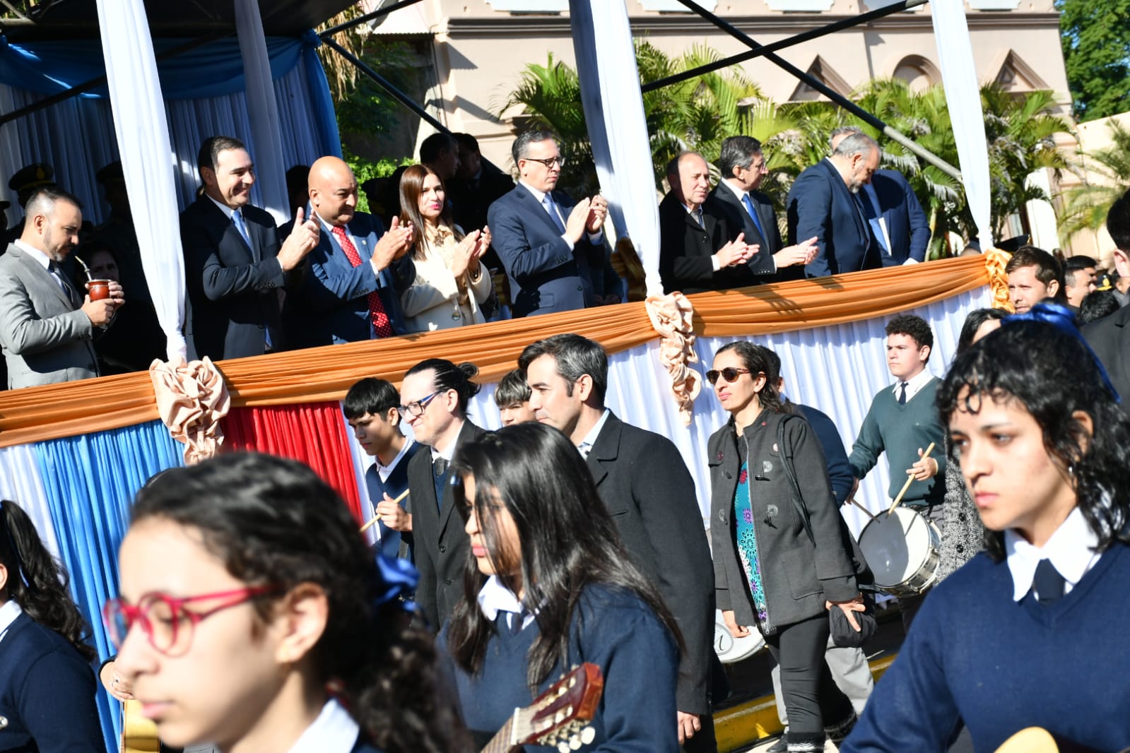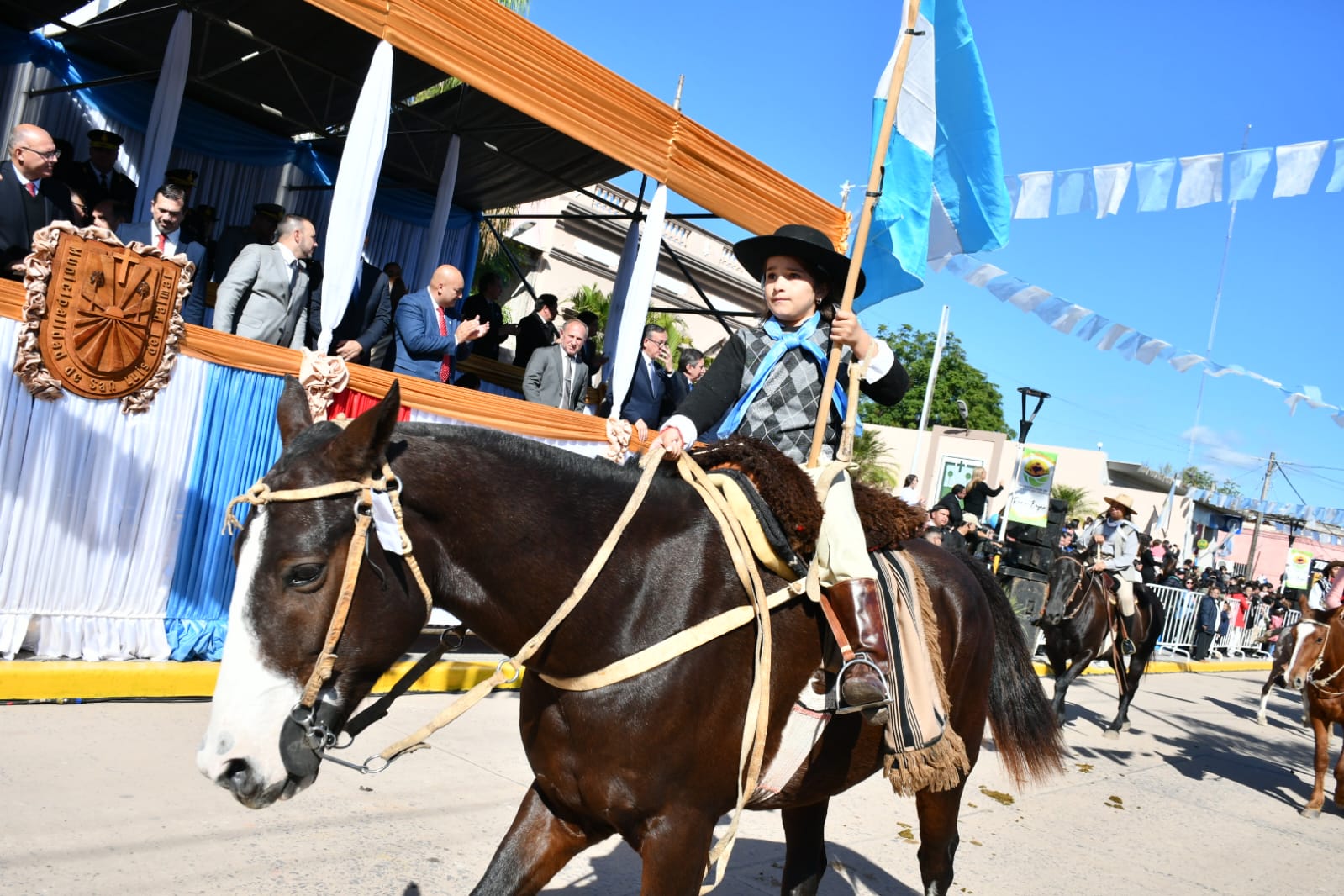 El acto tuvo lugar frente a la parroquia San Luis Rey de Francia, lugar icónico del pueblo que amalgama su fe, cultura y tradición. Funcionarios, fuerzas de seguridad, docentes, alumnos y vecinos entonaron las estrofas del Himno Nacional Argentino para luego escuchar las palabras del gobernador y el intendente.