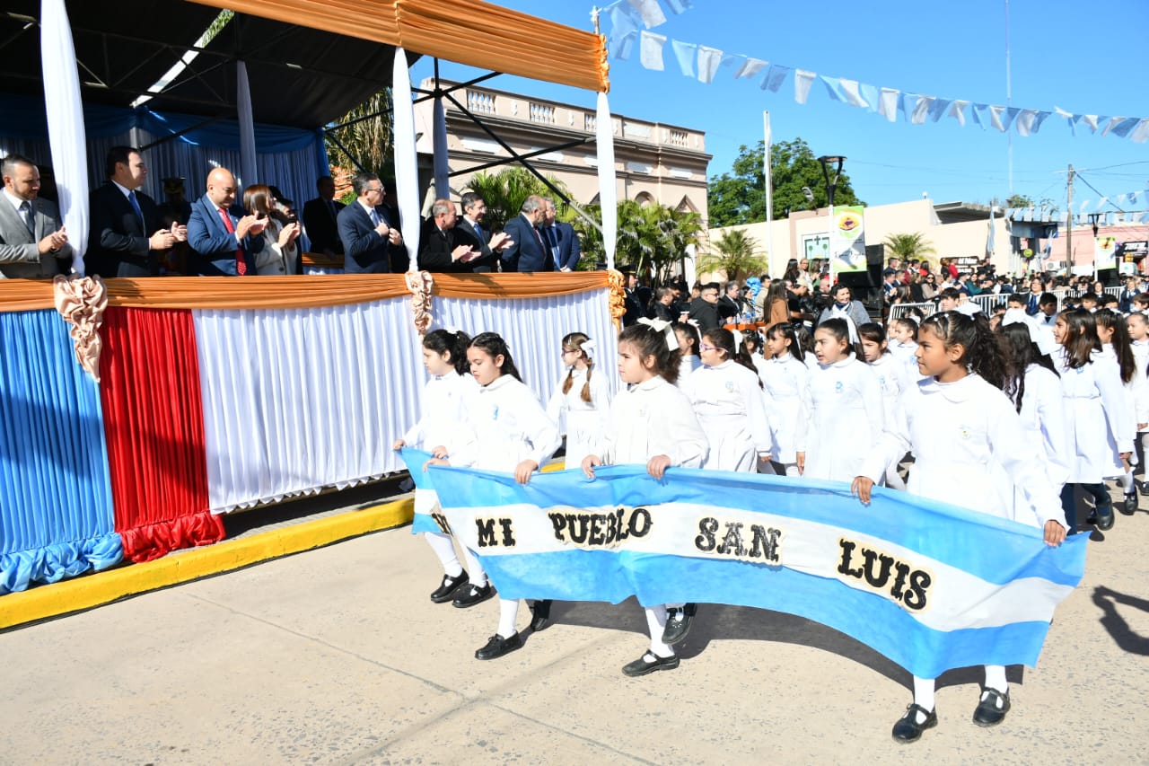 Para finalizar el acto, se procedió al tradicional desfile cívico-militar, donde escuelas, clubes, agrupaciones gauchescas y fuerzas de seguridad marcharon bajo los aplausos de la comunidad de San Luis.